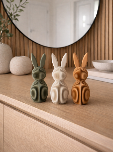 Adicione um toque moderno e delicado à sua decoração com este coelho decorativo produzido em impressão 3D. Com um design minimalista e elegante, é a peça perfeita para celebrar a Páscoa ou oferecer como presente especial aos padrinhos, familiares ou alguém querido.