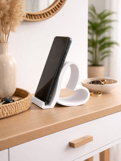 Este suporte de telemóvel em forma de coração, impresso em 3D, é ideal para manter o telemóvel sempre acessível e organizado, seja no móvel de entrada, secretária ou mesa de cabeceira.