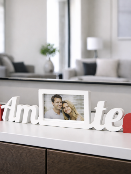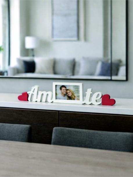 A Moldura Decorativa “Amo te” é produzida em madeira na cor branca, com design exclusivo,, separadas por uma moldura central. Os corações vermelhos acrescentam um toque romântico sem perder a harmonia do conjunto.