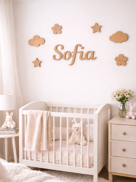 Crie um ambiente único no quarto do seu bebé com esta decoração de parede com nome personalizado em madeira MDF. Um conjunto delicado composto pelo nome do bebé acompanhado por nuvens, estrelas e flores, perfeito para dar um toque especial ao quarto infantil.