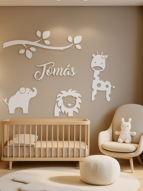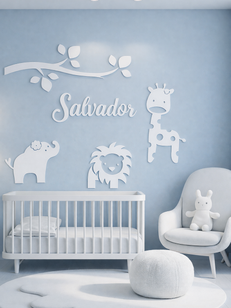 Transforme o quarto do seu bebé num espaço único com esta decoração de parede personalizada com nome e animais. Um conjunto delicado que combina o nome do bebé com elementos decorativos inspirados no mundo infantil.