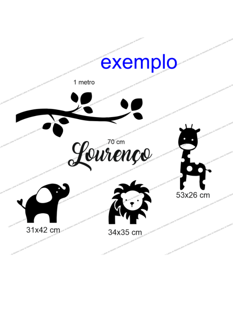 Este modelo inclui o nome personalizado acompanhado por animais decorativos, criando uma composição divertida e harmoniosa perfeita para quartos de bebé ou criança.