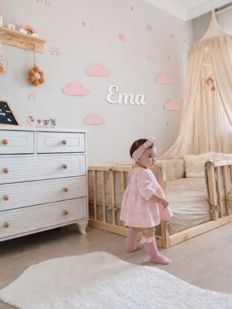 Transforme o quarto do seu bebé num espaço único, delicado e cheio de significado com o nosso nome personalizado em MDF de 5mm, acompanhado por 5 nuvens decorativas que criam um ambiente sonhador e acolhedor.