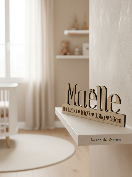 Capture a magia do dia mais especial da sua vida com o nosso nome personalizado em madeira, gravado com os dados de nascimento do seu bebé. Mais do que um artigo de decoração, esta peça é uma verdadeira joia de recordação, que marca o início de uma história de amor. Perfeita para decorar o quarto do bebé, a estante da sala ou oferecer como um presente carregado de emoção.