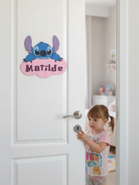 Esta não é apenas uma placa de identificação; é uma peça de design exclusivo, desenhada para transformar a porta do quarto num portal para um mundo de aventura. Com o personagem mais adorado de sempre, o Stitch, a espreitar por cima de uma nuvem fofinha, esta placa traz personalidade, cor e um sentimento de pertença a qualquer espaço infantil.